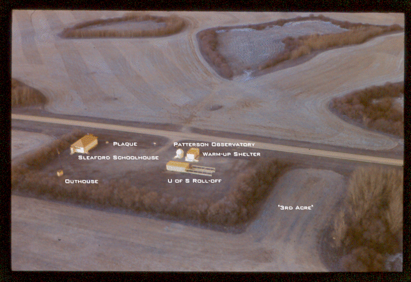 The Sleaford Observatory, taken from the air on November 4, 2001 (after the leaves have fallen off the trees in the windbreak). The view is looking toward the NNW. The Warm-up Shelter and Patterson Observatory were moved from the Saskatoon Centre's old Rystrom Observatory. The Warm-up shelter has since been expanded and now includes a heated composting toilet. The University of Saskatchwan 4-telescope Roll-off Observatory is 21.3m (70 ft) long from the west end to the end of the roof support beams. The site is 3 acres in area with all of the land enclosed by the wind break and includes the "3rd Acre", which is currently not developed. Photo by Rick Huziak. Directions to the Sleaford site are available on this map. |